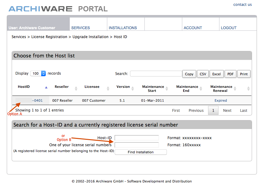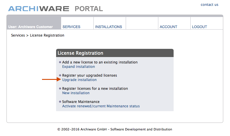 アップグレードを行う対象のインストール(ライセンス)を選択するか、アーキウェアポータルにログイン後、「License Registration」(ライセンス登録)をサービスメニューから選びます。