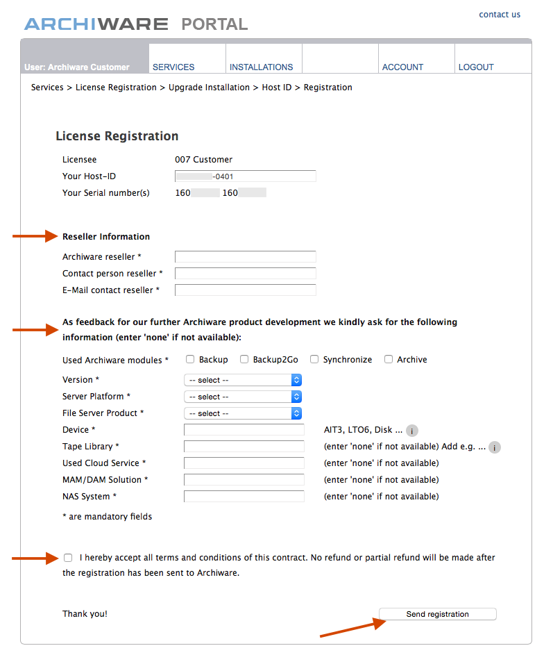 購入先のリセラー(販売店)情報ほか、必要な情報をすべて入力します。ソフトウェアライセンス使用条項に同意いただき、「Send Registration」(登録申請を送信)をクリックして登録申請を完了します。