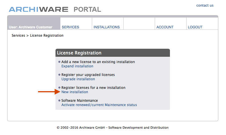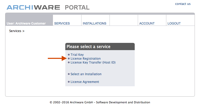 アーキウェアポータルにログインし、「License Registration」(ライセンスの登録)をサービスメニューから選びます。