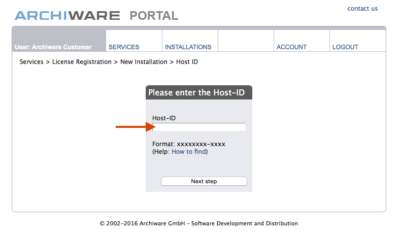 空欄にホストID(インストール先のコンピュータから得られる数値です)を「host-ID」欄に入力し、「Next step」をクリックします。ホストIDがわからない場合は、ヘルプリンク「How to find」から参照してください。