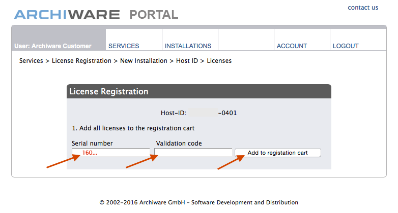 ライセンスのシリアル番号および取得ずみのバリデーションコード(認証コード)を入力して「Add to registration cart」(登録カートに追加)をクリックします。複数のシリアル番号を入力する必要がある場合は、次の画面で続けて入力します。すべての情報を入力したら「Next Step」(次のステップへ)をクリックして完了します。