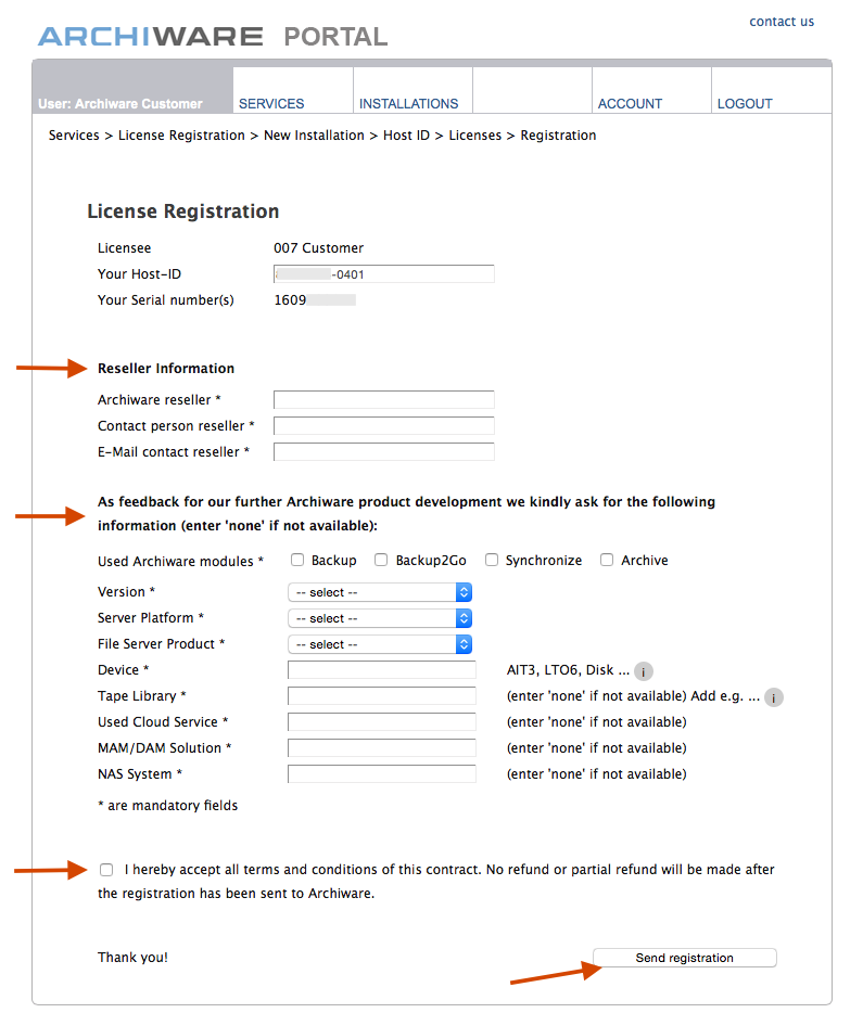 購入先のリセラー(販売店)情報ほか、必要な情報をすべて入力します。ソフトウェアライセンス使用条項に同意いただき、「Send Registration」(登録申請を送信)をクリックして登録申請を完了します。