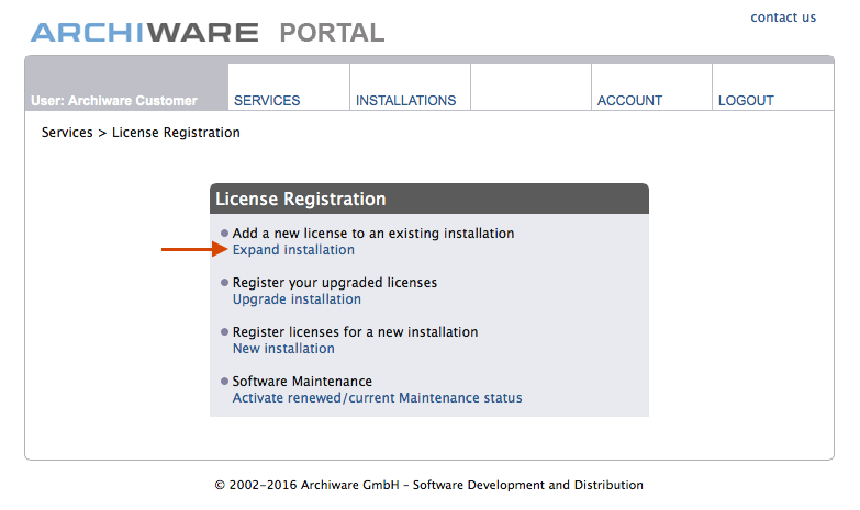 アーキウェアポータルにログインし、「License Registration」(ライセンスの登録)をサービスメニューから選びます。