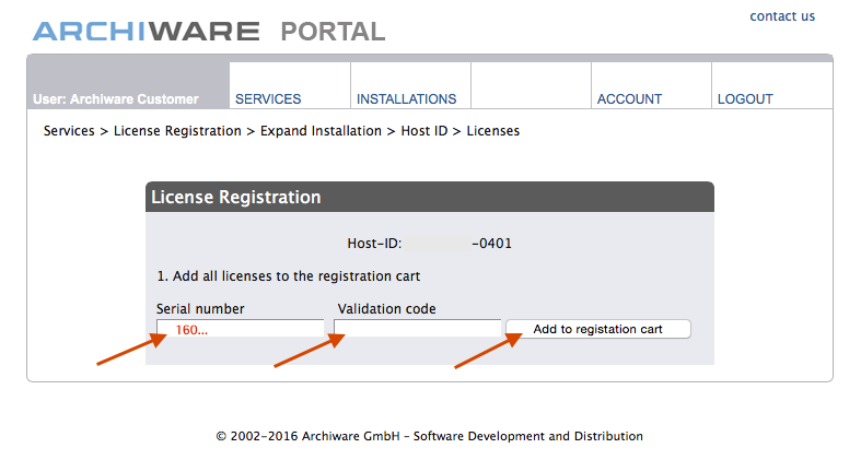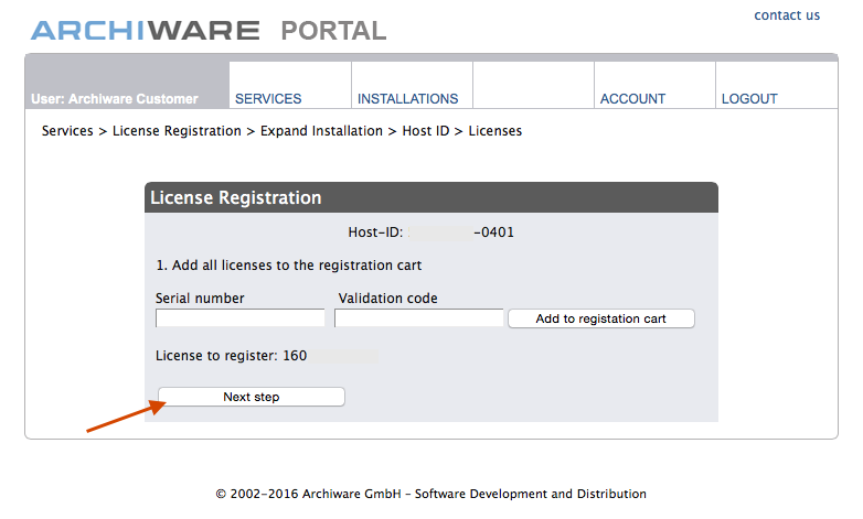 拡張を行う対象の元となるライセンスを特定したら、新しく追加する拡張ライセンスのシリアル番号およびバリデーションコード(認証コード)の入力を求められます。
