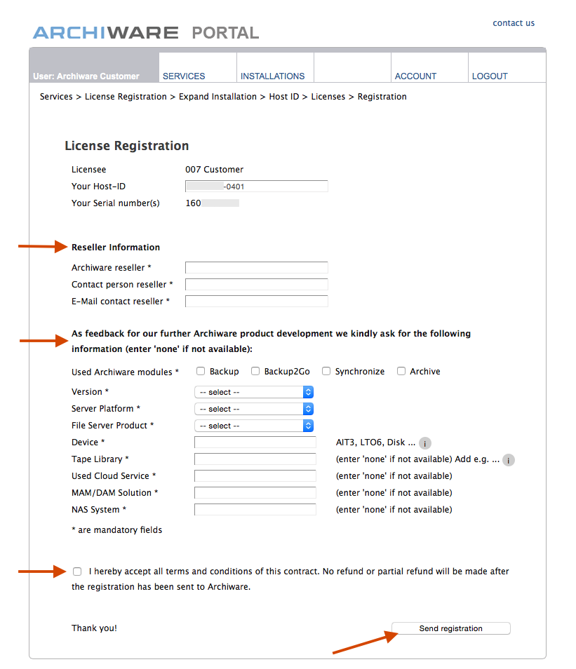購入先のリセラー(販売店)情報ほか、必要な情報をすべて入力します。ソフトウェアライセンス使用条項に同意いただき、「Send Registration」(登録申請を送信)をクリックして登録申請を完了します。