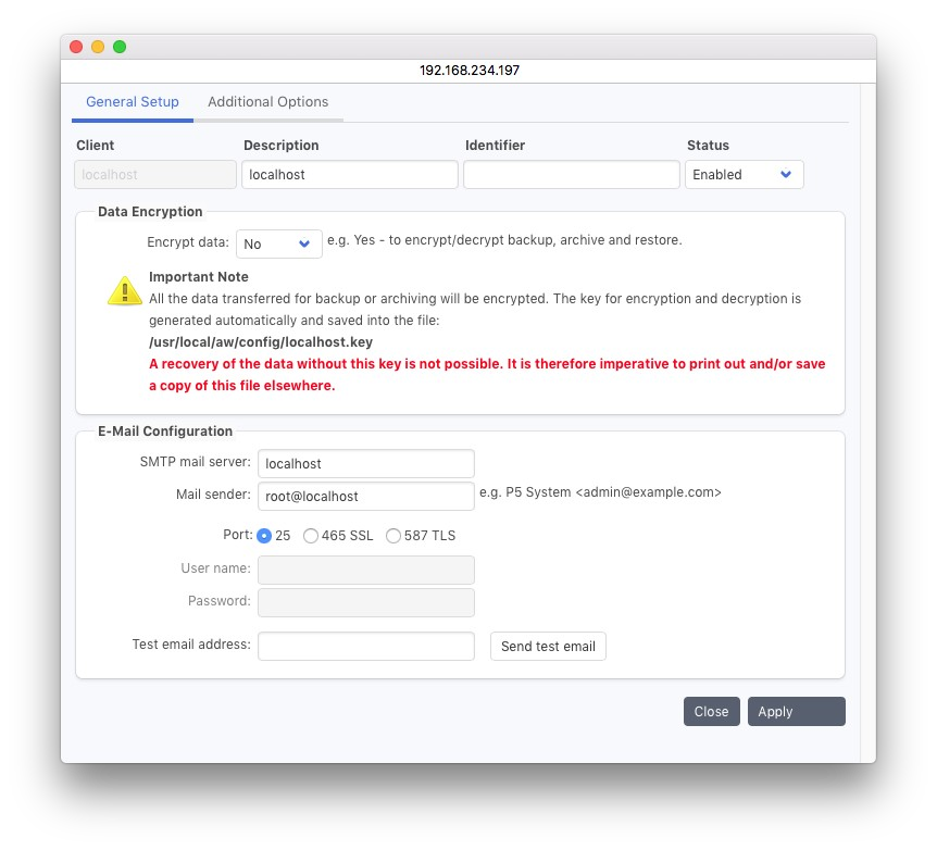 メール送信に使用するメール・サーバとメール・サーバへの接続方法を設定するには、localhost クライアント設定を開きます。localhostクライアントの見つけ方については6.10.1項 「クライアントの作成」を参照してください。