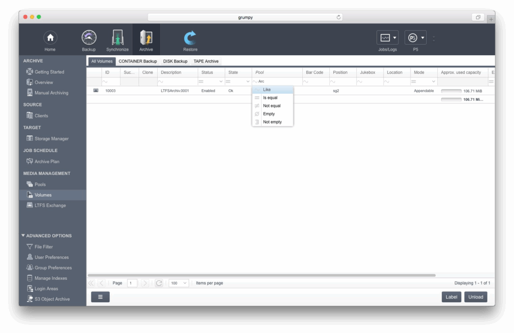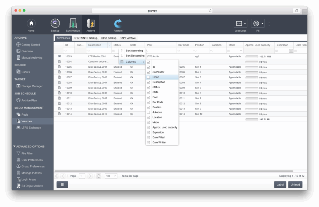 テーブルビューはカスタマイズできます。列の見出しの横にある三角形をクリックすると、列を無効にしたり、並べ替えたりできます。何百ものボリュームがブラウザの複数のページを埋め尽くしているような巨大なリストには、フィルタを追加定義して特定のサブセットのみをフィルタリングすると便利です。