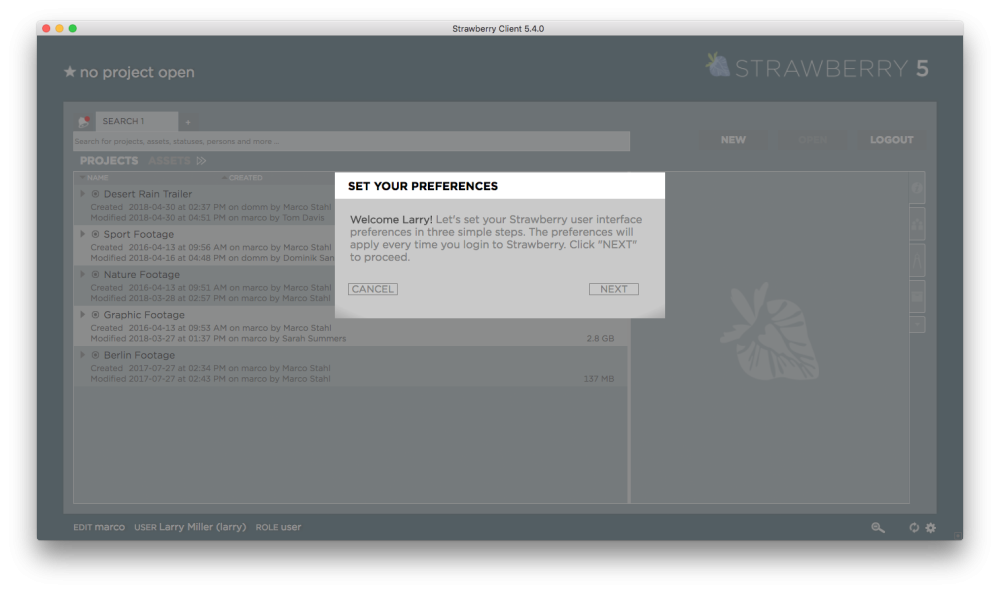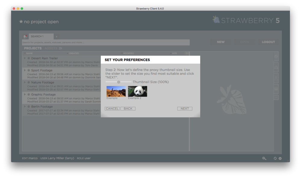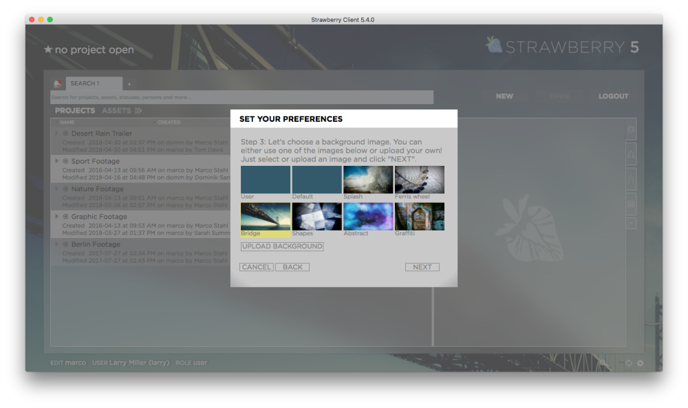- Strawberryが標準搭載する背景画像の1つを選択するか、「UPLOAD BACKGROUND (背景をアップロード)」ボタンをクリックしてカスタム背景画像をアップロードします。カスタム背景をアップロードする場合は、最小でも 1920 × 1080 ピクセルの解像度があることを確認してください。通常 4K または 8K 画面で作業している場合は、必ず適切なサイズの背景画像をアップロードしてください。画像を選択して「NEXT 」をクリックします。