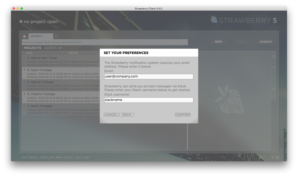 設定の変更はStrawberryにログイン中にユーザーインターフェイスの右下隅の設定ホイールからいつでもできます。