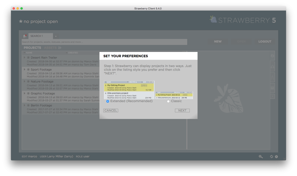 - プロジェクトリストの表示方法を指定します。 「EXTENDED (拡張)」ビューでは各プロジェクトの詳細な情報が表示され、「CLASSIC (クラシック)」ビュープロジェクトが表示数がより多くなります。指定して「NEXT (次へ)」をクリックします。