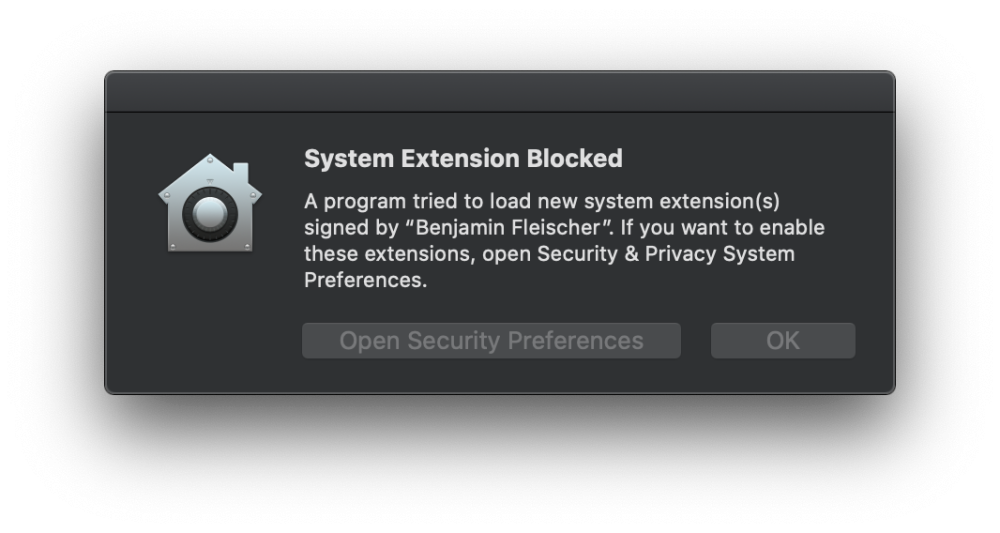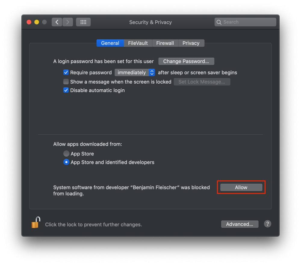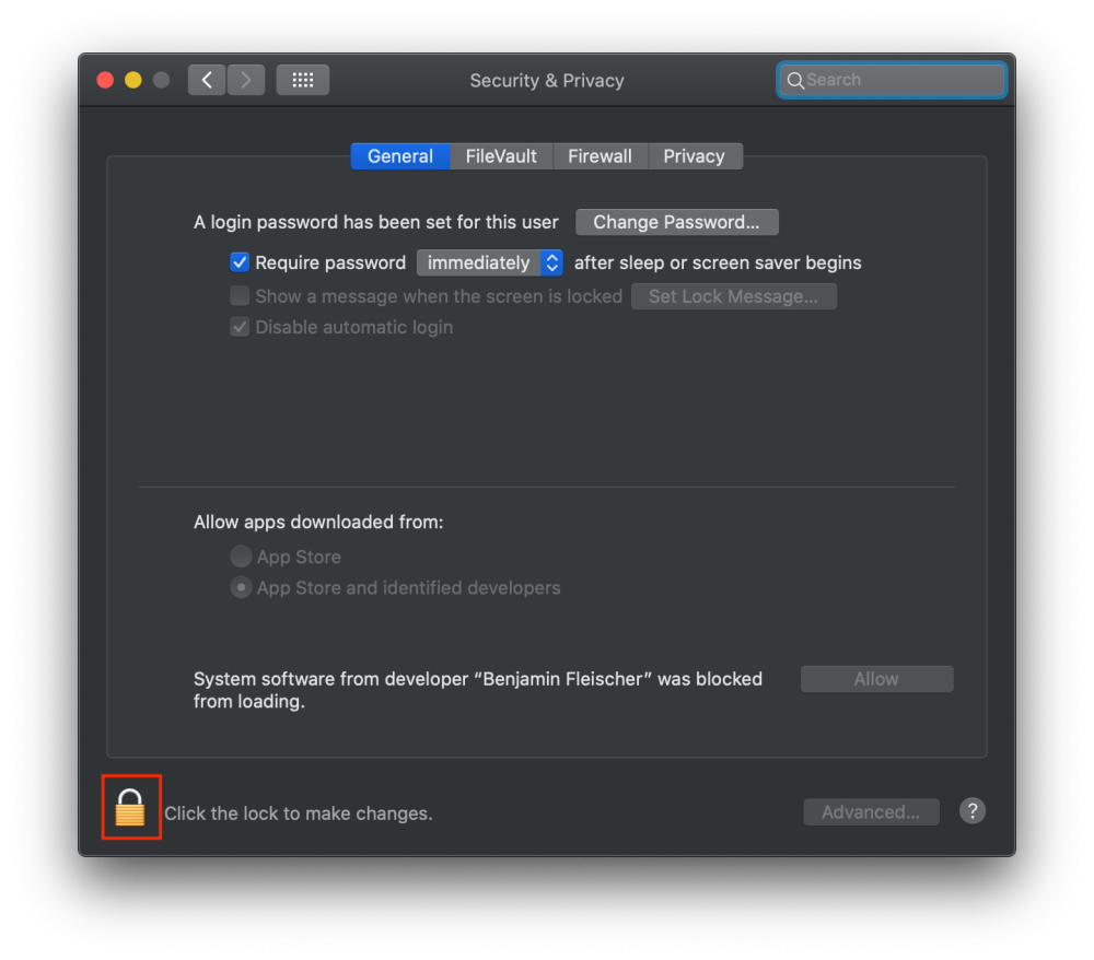 - 設定のロックが解除されたら、「開発者「Benjamin Fleischer」のシステム ソフトウェアの読み込みがブロックされました」というメッセージの横にある「許可」ボタンをクリックします。