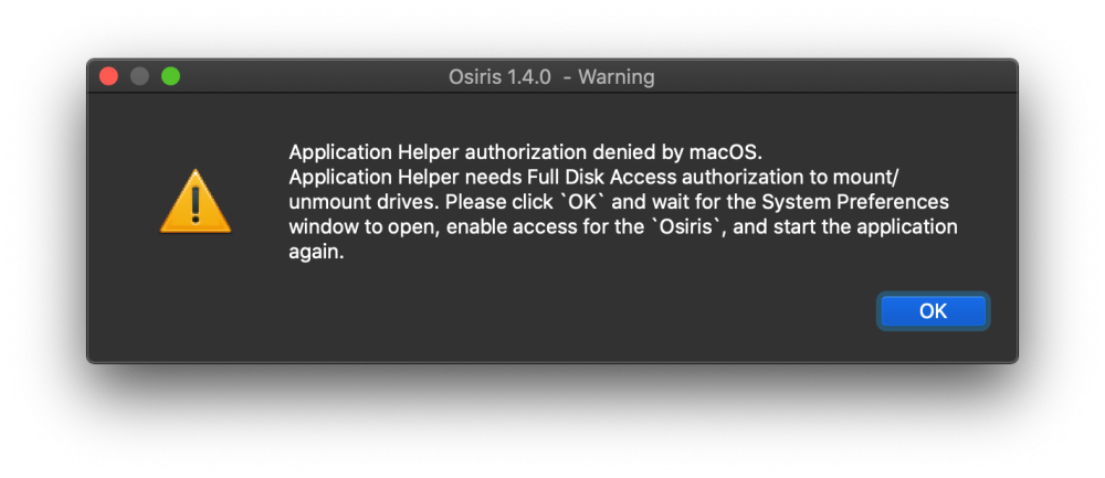 - オシリスを再度起動します。 「アプリケーション ヘルパーの認証が macOS によって拒否されました」というメッセージがまだ表示される場合は、このページの下部にあるトラブルシューティング セクションを確認してください。