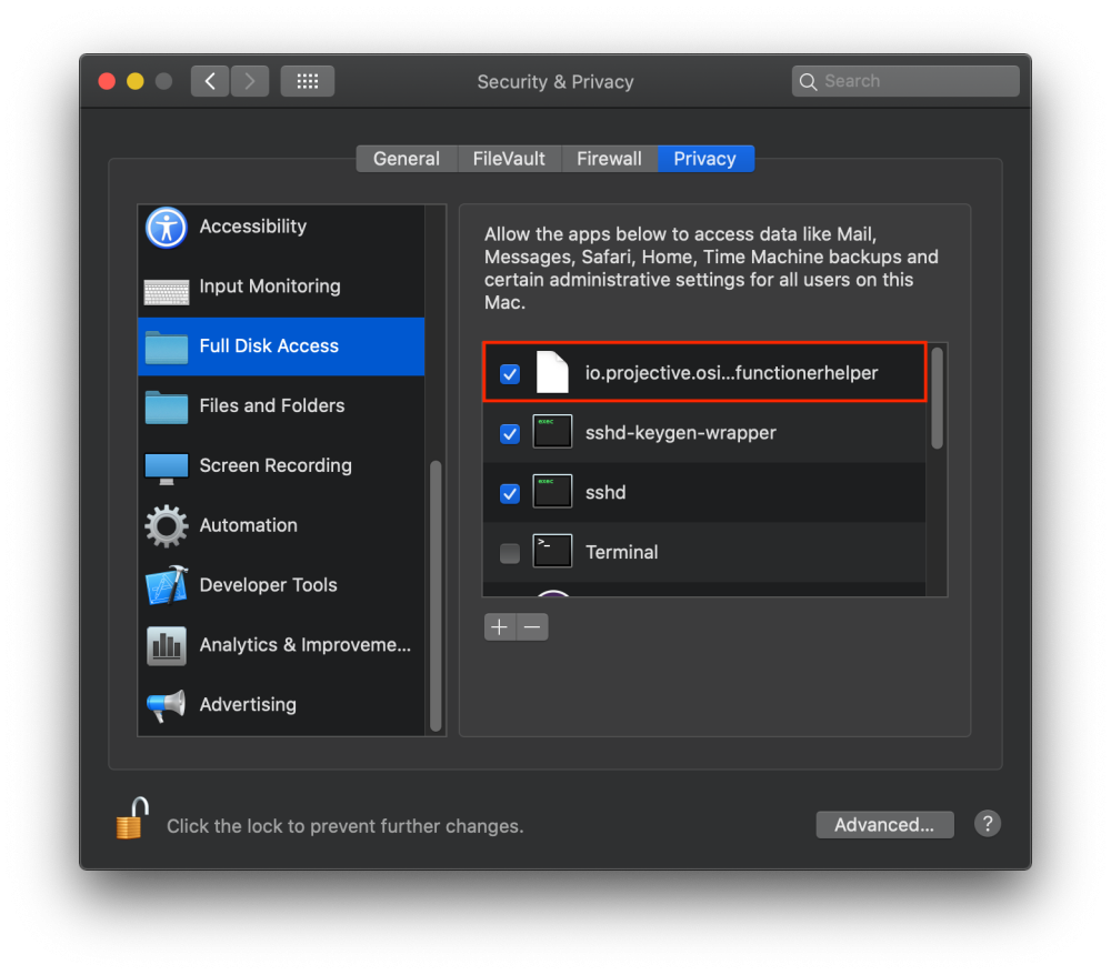 Full Disk AccessOsiris 2 の横にあるトグル ボタンをクリックして設定のロックを解除します。