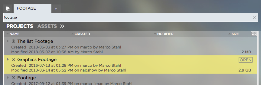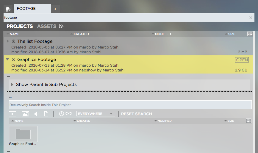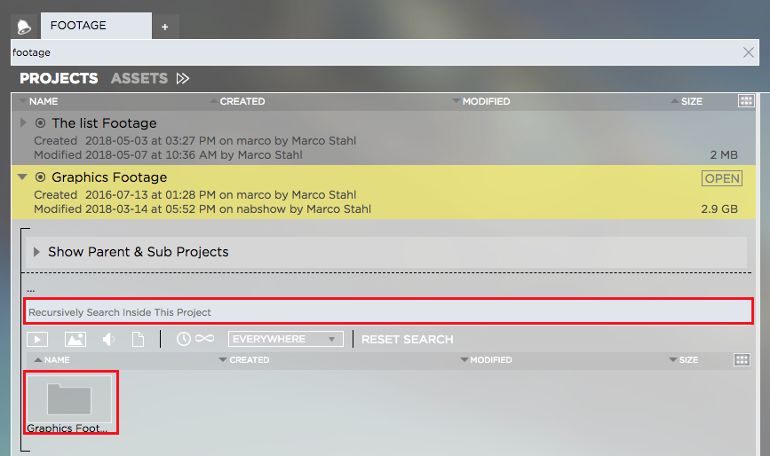 - 検索フィールドを使用して、この特定のプロジェクト内のメディア アセットを検索するか、フォルダー アイコンをクリックしてプロジェクトのフォルダー構造に入ります。