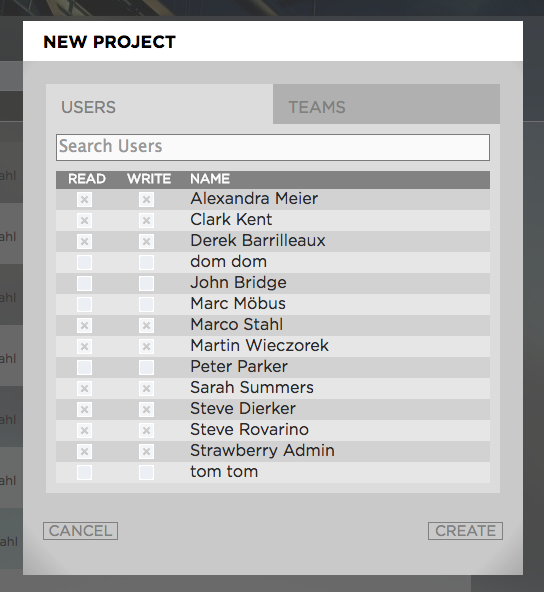 - 「ユーザー」タブと「チーム」タブを使用して、プロジェクトを個々のユーザーまたはチームに割り当てます。 「READ(読み取り)」および「WRITE(書き込み)」アクセス権を持つユーザーは、ワークステーション上でプロジェクトを開いて変更することができます。読み取り専用アクセス権を持つユーザーは、Strawberryユーザーインターフェイスでプロジェクトを表示および参照できますが、プロジェクトを開いて変更することはできません。次に「Create(作成)」をクリックします。