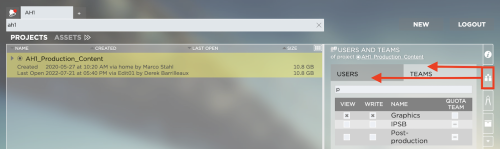 UserUI の右側にあるタブをクリックし、Userタブをクリックしてプロジェクトを個々のユーザーに割り当てるか、Teamsタブをクリックして 1 つ以上のチームにプロジェクトを割り当てます。