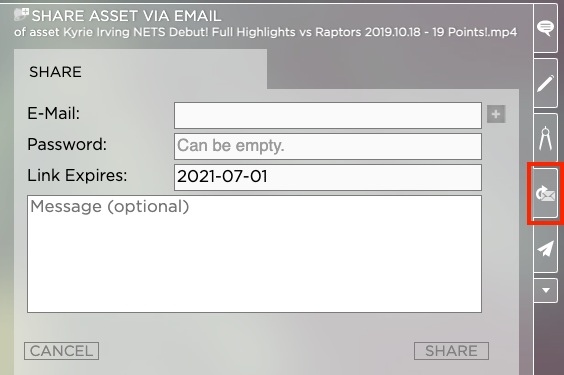 2. 右側にある [Eメールで共有] タブをクリックするか、アセットを右クリックしてコンテキスト メニューからShare[->]を選択します。Share via Email