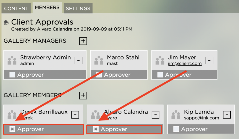 3. 承認者権限を付与したい人がすでにギャラリーに存在する場合は、Approverユーザー名の下にあるチェックボックスをオンにするだけです。その人がギャラリーのメンバーではない場合は、まずその人を招待する必要があります。