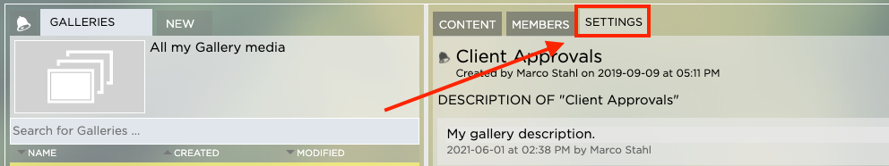 2. ギャラリーの上部にある「SETTINGS (設定)」タブをクリックします。