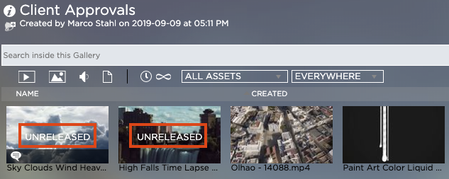 未リリースのギャラリー アセットには、プレビュー サムネイルに「未リリース」タグが付いています