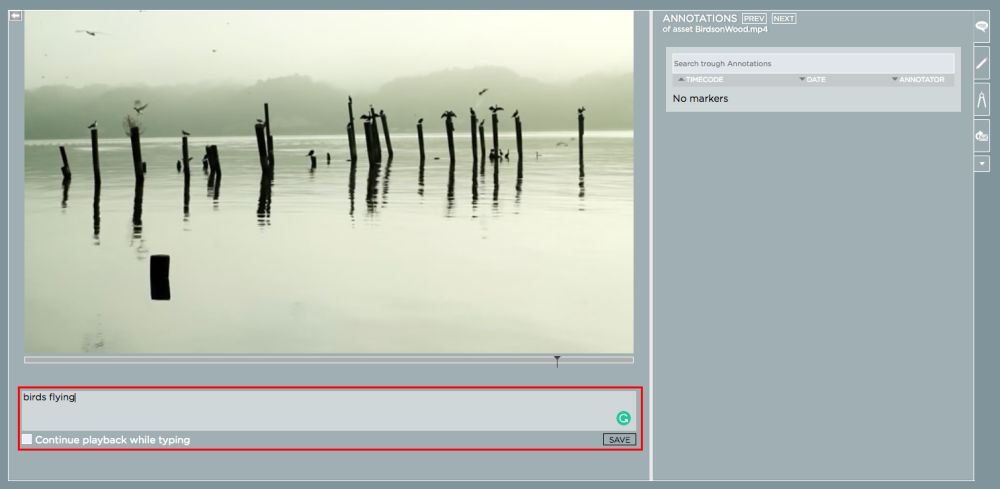- ビデオの再生中にテキストフィールドに注釈を入力し、「Enter」を押してアノテーションを保存することで、「その場で」アノテーションを付けることができます。デフォルトでは、入力中にビデオが一時停止します。入力中にビデオの再生を続けたい場合は、テキストフィールドの下にある「入力中に再生を続ける」の横のボックスにチェックを入れてください。