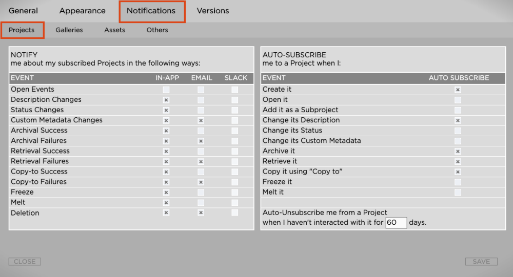 3. 「Notifications (通知)」をクリックし、「Projects (プロジェクト)」タブをクリックします。