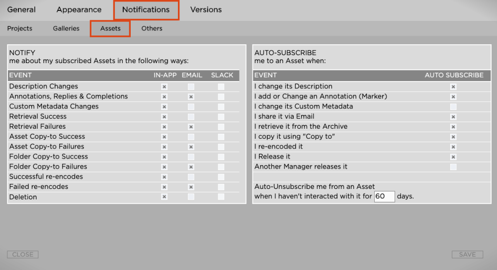 スパムを回避するために、何日間操作がなかった場合にアセットのサブスクリプションを自動的に解除するかを定義できます。アセットのインタラクションは次のとおりです。