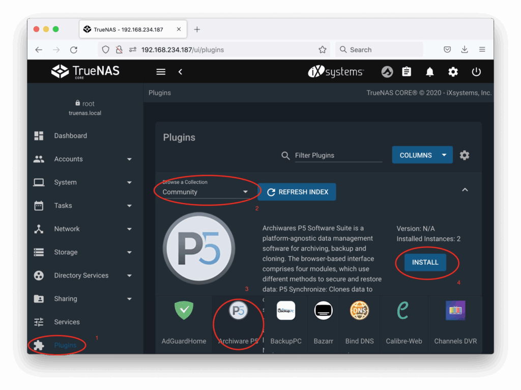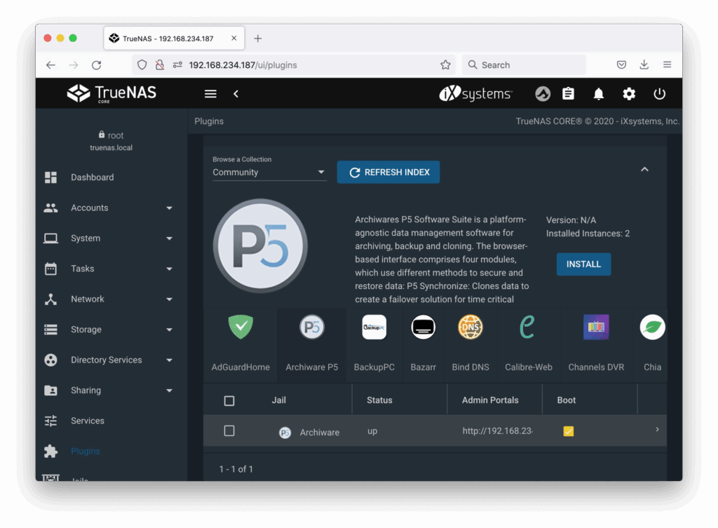 TrueNAS システムでは、ArchiwareP5Suite はプラグイン メニューからインストールできます。