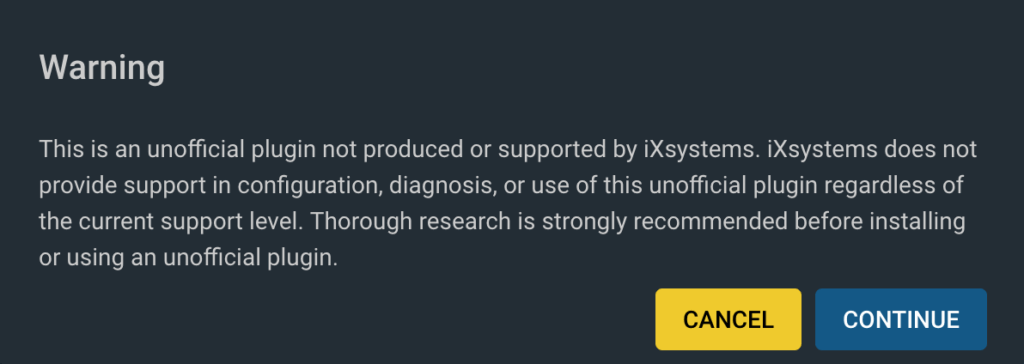 このプラグインは iXsystems によって作成またはサポートされていないという警告とともに新しいウィンドウが開きます。続行するには、[続行] を選択します。