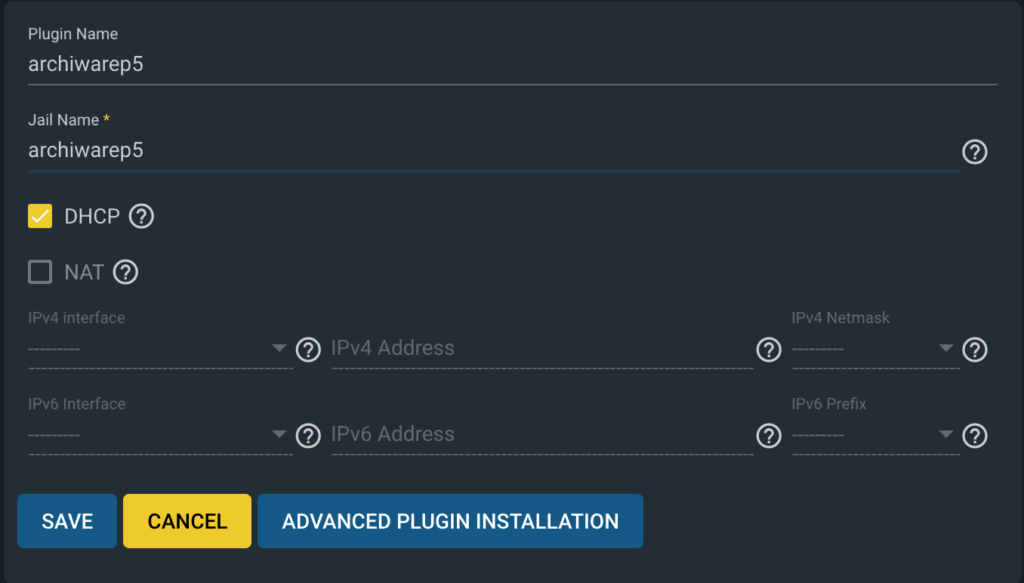 次に、インストール オプションを含む次の新しいウィンドウが表示されます。デフォルトのインストールでは、新しい P5 プラグインの Jail の希望する名前を入力して、[保存] を選択します。