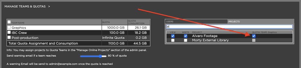 - 選択したチームのクォータに追加するプロジェクトの横にある