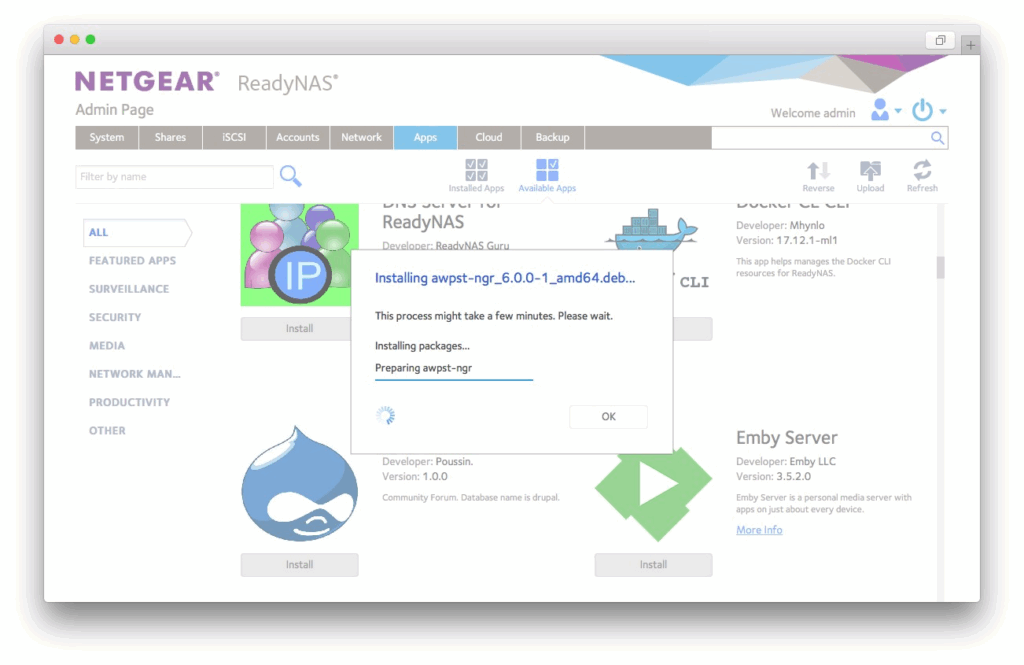 ReadyNASデバイスのWeb インターフェイスにログオンし、[アプリ] メニューを開きます。右上隅の [アップロード] を選択します。[参照] を選択し、ダウンロードした P5 ReadyNASパッケージを含むフォルダーに移動します。.deb ファイルを選択し、[アップロード] を押してインストールプロセスを開始します。