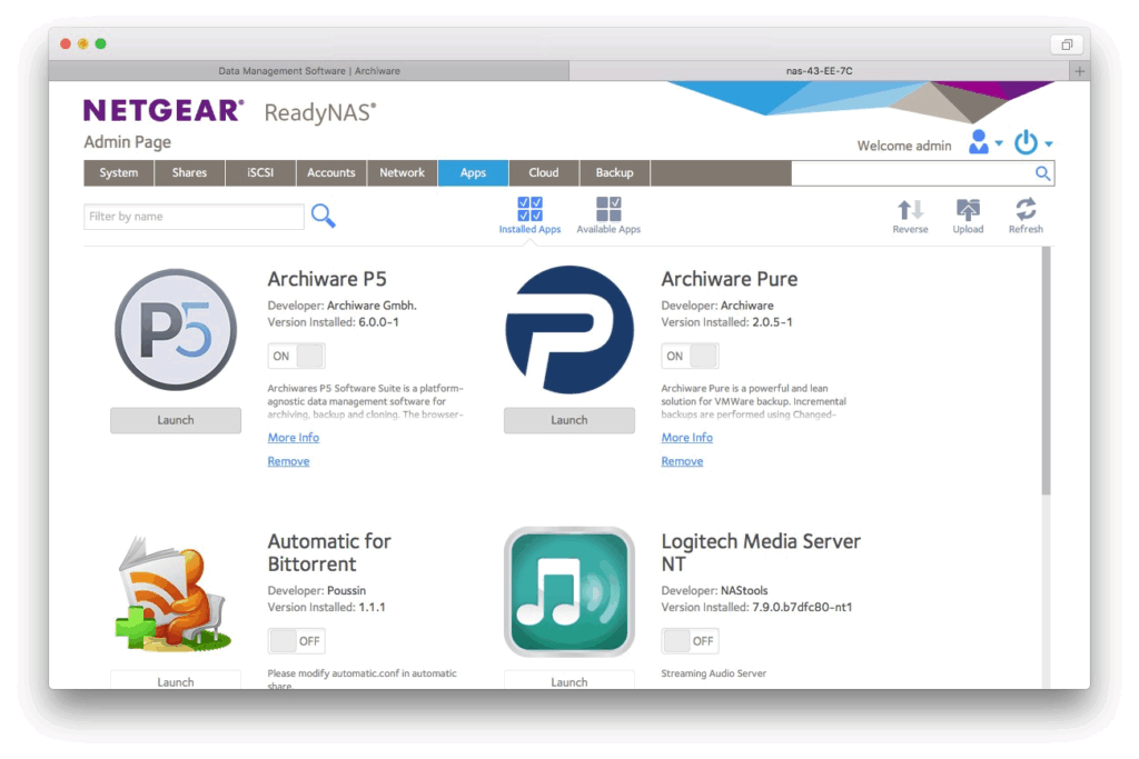 ReadyNAS システムでは、Archiware P5 Suite はアプリメニューからインストールが可能です。