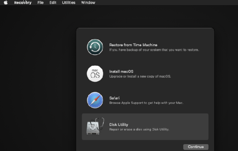 - Touch ID または電源ボタンを押したままにしてマシンの電源を入れ直し、リカバリ モードで起動します。