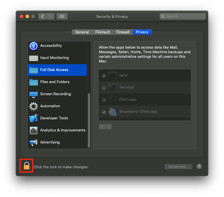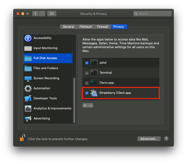 - 「フルディスクアクセス」をクリックし、「Strawberry Client.app」の横のチェックボックスをオンにします。