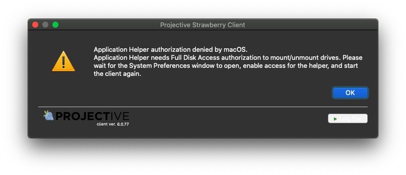 macOS の「フル ディスク アクセス」セキュリティ設定にエントリ「Strawberry Client.app」が表示されない場合は、設定を開いたままにし、クライアントを再起動します。 「アプリケーション ヘルパーの認証が macOS によって拒否されました」というメッセージが表示されたら、「OK」ボタンをクリックし、そのエントリがシステム環境設定に表示されるかどうかを確認します。