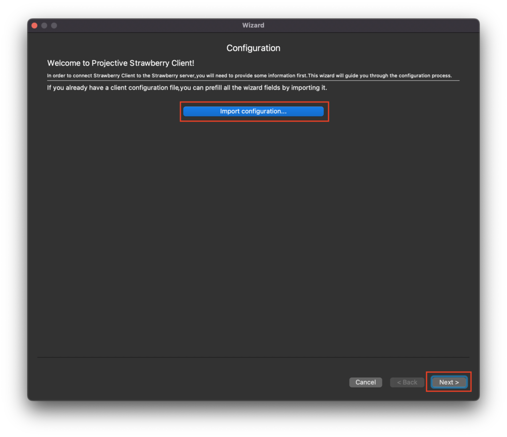 3. 次のウィンドウで、既存の構成ファイルをインポートするように求められます。既存の構成ファイルがある場合は、「Import」ボタンをクリックしてファイルを選択します。これにより、構成に必要なほとんどの値が事前に入力されます。既存の構成ファイルがない場合は、 「Next >」をクリックします。クリックすると、サーバー構成に移動します。