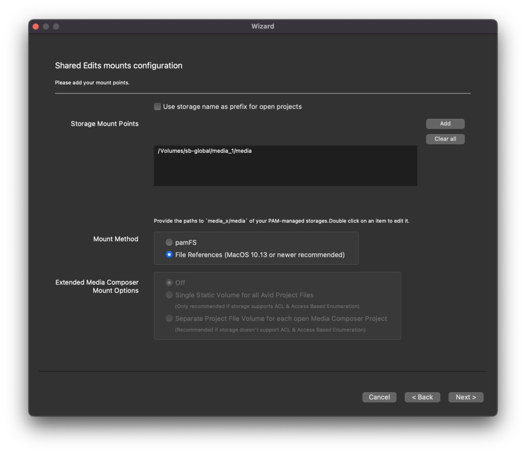 File Referencesを使用します。このコンピューターで Media Composer を使用している場合は、pamFSを使用してください。 - Extended Media Composer Mount Options (拡張 Media Composer マウント オプション) : これらの設定の詳細については、ここをクリックしてください。