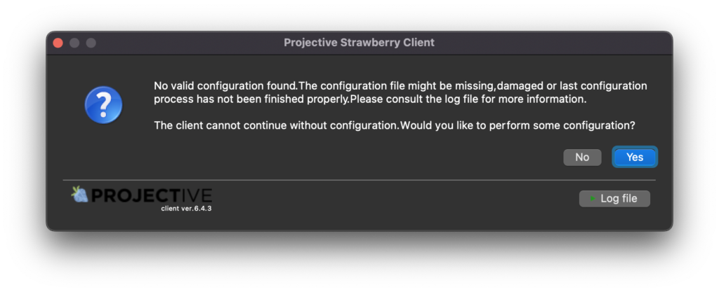 1. Strawberryクライアントの初回起動時に「No valid configuration found .(有効な構成が見つかりません)」というメッセージが表示されます。
