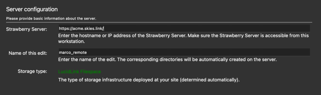 - Use storage name as prefix for open projects (開いているプロジェクトのプレフィックスとしてストレージ名を使用する): Strawberry サーバーが複数の物理ストレージ ボリュームを管理している場合にのみ、このボックスをオンにします。それ以外の場合は、ボックスのチェックを外したままにしてください。