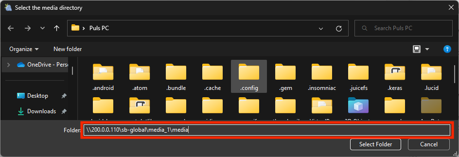 • Storage mount points (ストレージ マウント ポイント) : Addボタンをクリックして、ストレージ上のディレクトリに移動します。あるいは、AddFolderボタンをクリックして、次に示すようにフィールドにUNCmedia_1/mediaパスを入力することもできます。