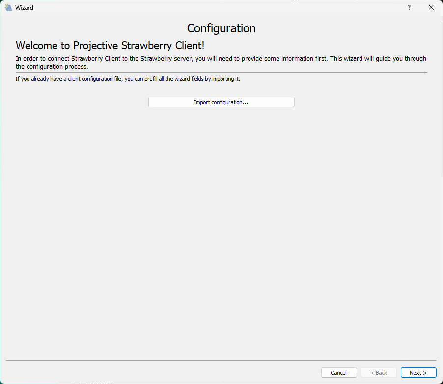 3. 次のウィンドウで、既存の構成ファイルをインポートするように求められます。既存の構成ファイルがある場合は、[Import configuration]ボタンをクリックしてファイルを選択します。これにより、構成に必要なほとんどの値が事前に入力されます。既存の構成ファイルがない場合は、[ Next >]をクリックします。クリックすると、サーバー構成に移動します。