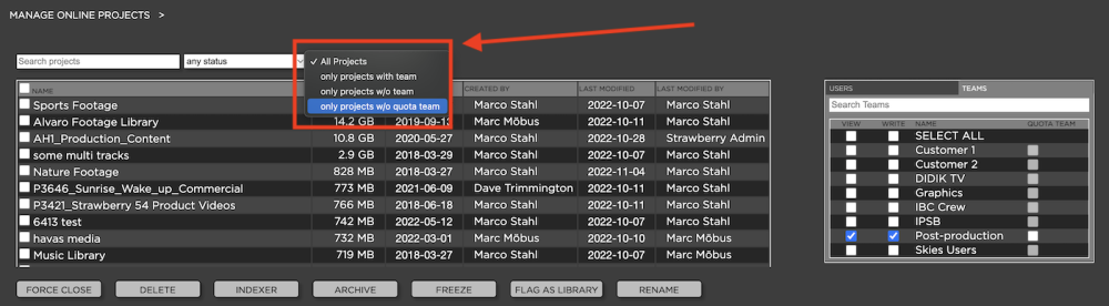 *プロジェクト リストの上にあるドロップダウン メニューを使用して、見積書のないすべてのチームをリストできます。