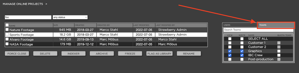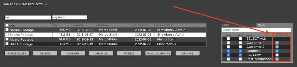 5.Quota Teamクォータ チームとなるチームの横にあるチェックボックスをオンにします。プロジェクトは、チームが少なくとも読み取りアクセス権を持っている場合にのみ、チームの割り当てにカウントされることに注意してください。