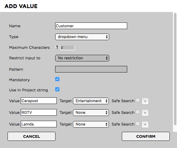 ドロップダウン メニューの値をValueフィールドに入力できるようになりました。+値フィールドの右側にあるボタンをクリックしてドロップダウン値を追加し、追加が完了したら”Confirm (確認)”を選びます。