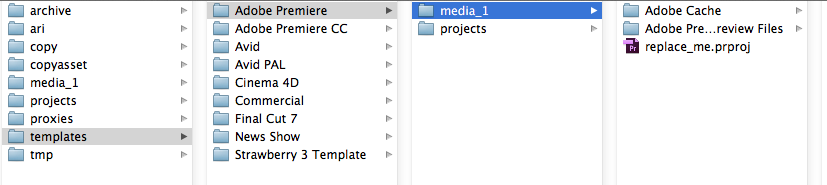 3. 完了したら、共有ストレージ上の関連する Strawberry テンプレートの場所にテンプレート プロジェクト ファイルを保存します。管理パネルでテンプレートの作成時に選択したトークンにちなんでプロジェクト ファイルに名前を付けます。デフォルトのトークンは「replace_me」なので、Adobe Premiere Pro テンプレート プロジェクト ファイルの名前は「replace_me.prproj」になります。