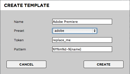 - パターン: ユーザーが新しいプロジェクトを作成すると、デフォルトのパターン「%Y%m%d-name」は、たとえば「20180501-Projectname」に変換されます。ファイル名やフォルダ名に日付を含めたくない場合は、トークンとして「%name」を使用します。プリセットに独自の日付と番号スキームを追加する場合は、「サポートされている Unix 時間修飾子」のリストをご覧ください。