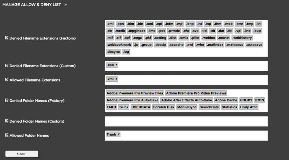 Denied Folder Names (Factory) (拒否されたフォルダー名 -ファクトリーデフォルト)にあるフォルダー名を許可する必要がある場合は、その拡張子を「許可されたフォルダー名」リストに入力するだけです。テキストフィールドにフォルダー名を入力して Enter キーを押すだけです。保存ボタンを押して確認します。