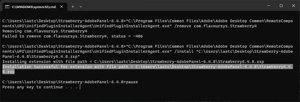 「install.cmd」ファイルをダブルクリックします。 Creative Cloud Manager が実行されていない場合は、自動的に起動します。インストールが完了すると、コマンド プロンプトに成功メッセージが返されます。