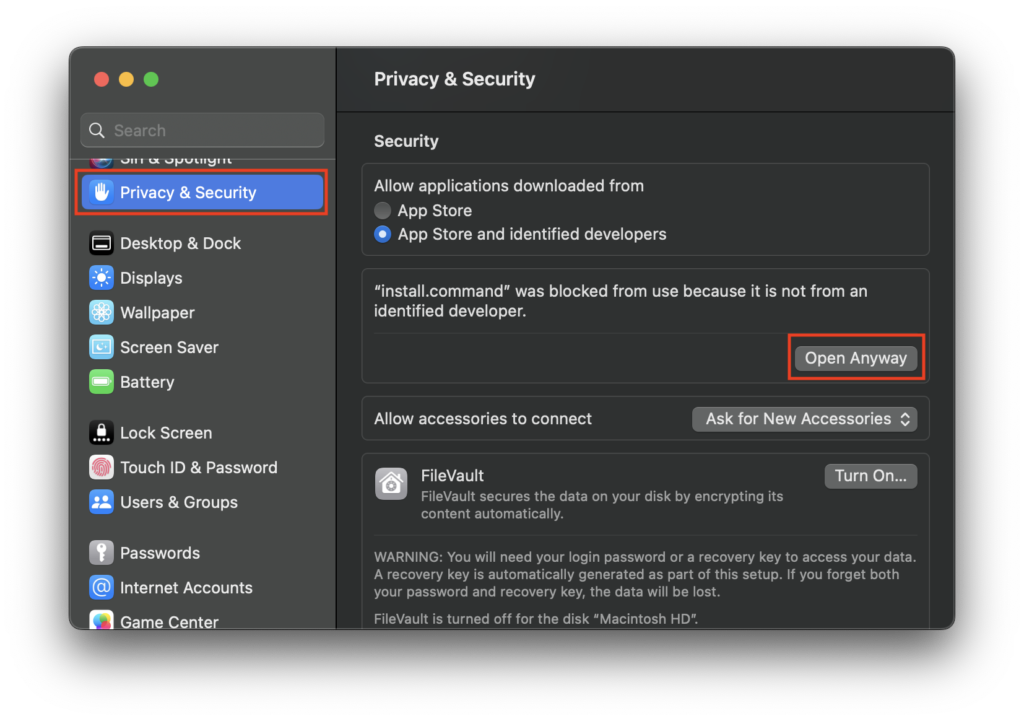“install.command” cannot be opened because it is from an unidentified developer.が表示されたら、「OK」をクリックます。The application “Terminal” can’t be opened.と表示されたら、再度「OK」を一度クリックします。- システム環境設定を開いてプライバシーとセキュリティに移動します。